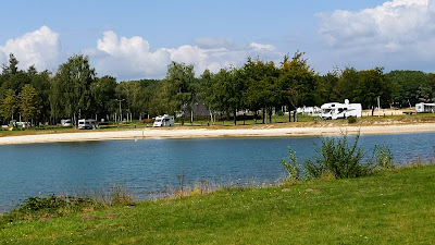 Landgoed We hebben een mooi, maar wel wat ongelijke plek op Landgoed (Camperplaats) Duynenwater in Eersel. Stroom heb ik niet aangesloten: ik reken op de zon. Strand voor de deur. In ruim een uurtje rijden waren we er vanmorgen. Bram wilde z'n nieuwe fiets meenemen: dat paste probleemloos en zonder 'verbouwing' op de Busbiker.